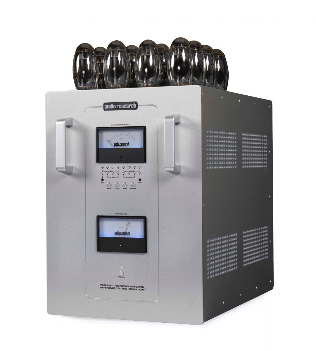Самый мощный усилитель в линейке ламповых аппаратов Audio Research на сегодняшний день. Двухтактные моноблоки выдают по 750 Ватт на канал за счет использования шестнадцати ламп KT-150, по восемь в каждом плече. В драйверном каскаде также работает подобранная пара KT-150. Пиковые значения мощности достигают 840 Ватт на 1 кГц, весит каждый усилитель 77,2 килограмма. Управление и подстройка режимов осуществляется с передней панели, там же расположены столь любимые всеми стрелочные индикаторы, отображающие уровень сигнала. Стоят монофонические усилители Audio Research Reference 750 SE порядка 70 000 долларов США за пару.